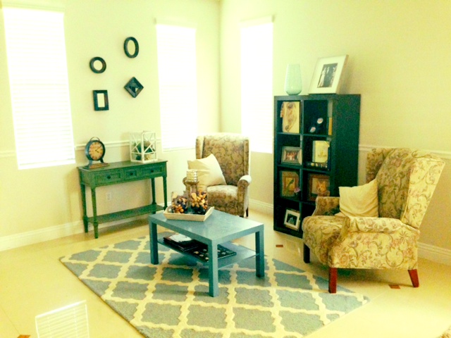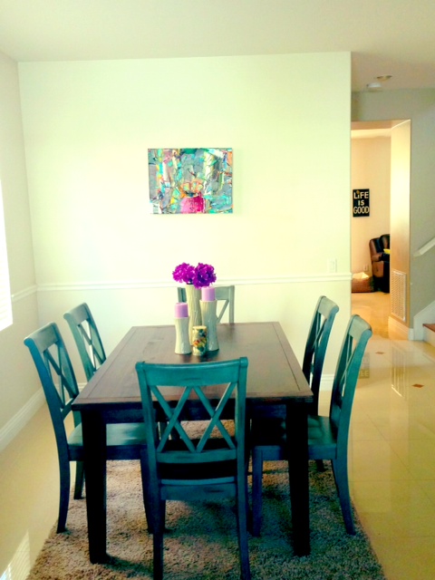 The sitting room runs into the dining room. I like having different colored chairs from the color of the table. It makes the table “pop”. Also, adding a family friend’s painting to the room brings in a sense of art culture…plus, it’s a great talking piece.